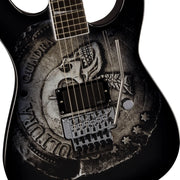 This model features a Nyatoh body, a real thru-maple constructed neck with graphite reinforcement, a bound 12-16" compound radius fingerboard and 24 jumbo nickel frets. This guitar is armed with a single EMG 81 humbucker in the bridge position, a single volume control and a Floyd Rose 1000 series bridge, perfect for dive bomb acrobatics. Dressed with the striking "Quadra" insignia, this guitar looks as ferocious as it plays and sounds!!