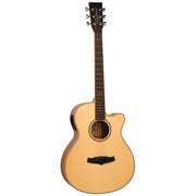 The Sundance Premier series by Tanglewood combines traditional tonewood pairings with modern design and reliable performance. This Super Folk cutaway model features a spruce top paired with mahogany back and sides, delivering a well-balanced tone with clear highs, warm mids, and a solid low-end response.